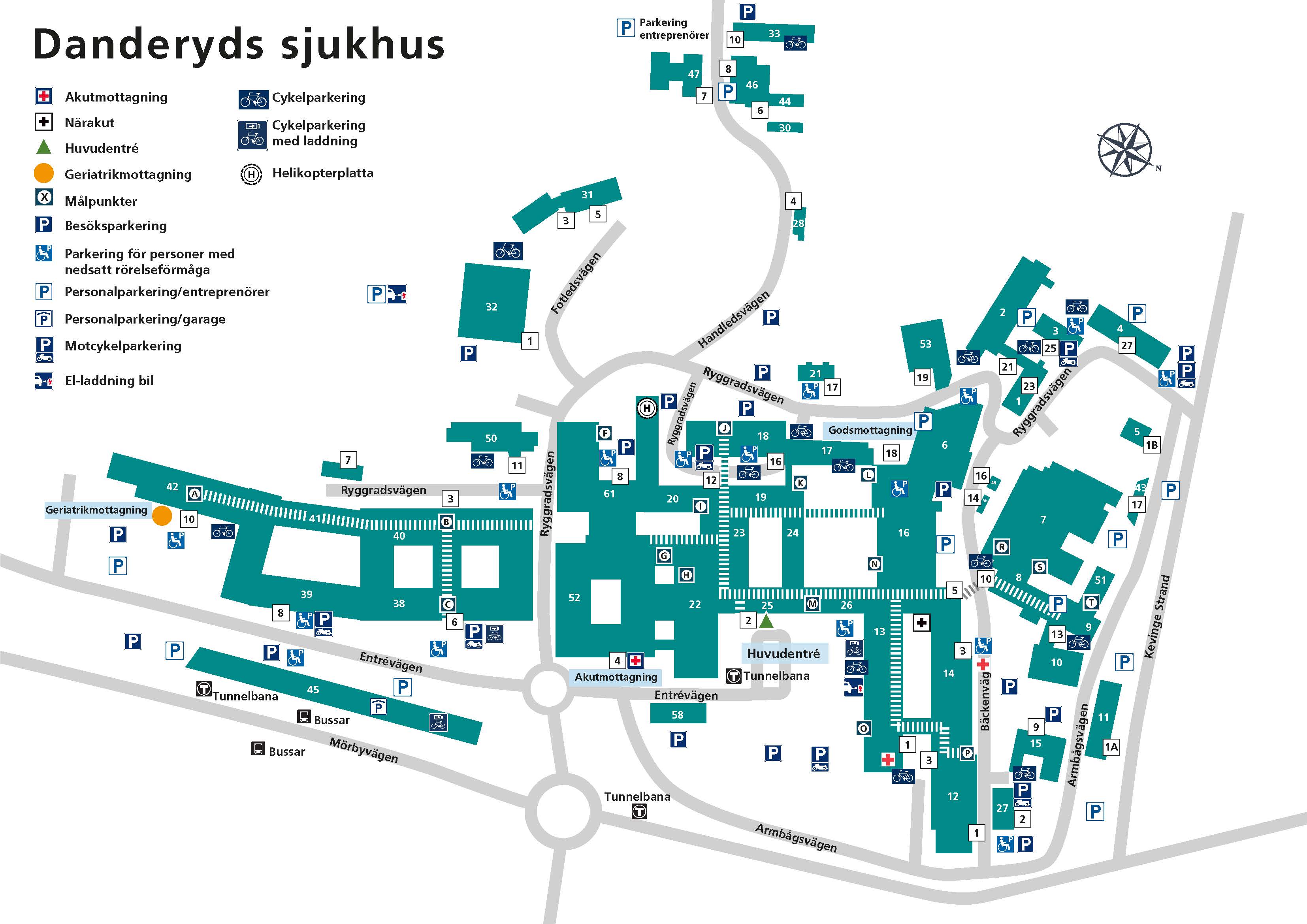 Här hittar du kartor över Danderyds sjukhusområde med parkeringar för besökare, personal och cykel.