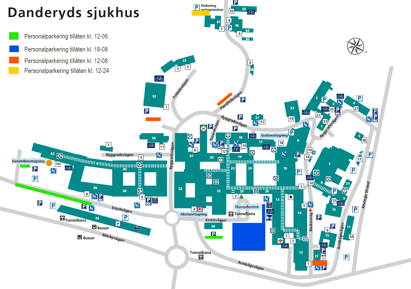 Personaltaxa gäller på personalparkeringarna. Observera att det under vissa tider är tillåtet för personal att parkera med personaltaxa på några av sjukhusområdets besöksparkeringar, till exempel under eftermiddagar, kvällar och nätter. Detta gäller parkeringarna i de områden som är markerade med grönt, blått, rött och gult i bilden. Tiderna finns angivna på tilläggstavlor vid parkeringarna.