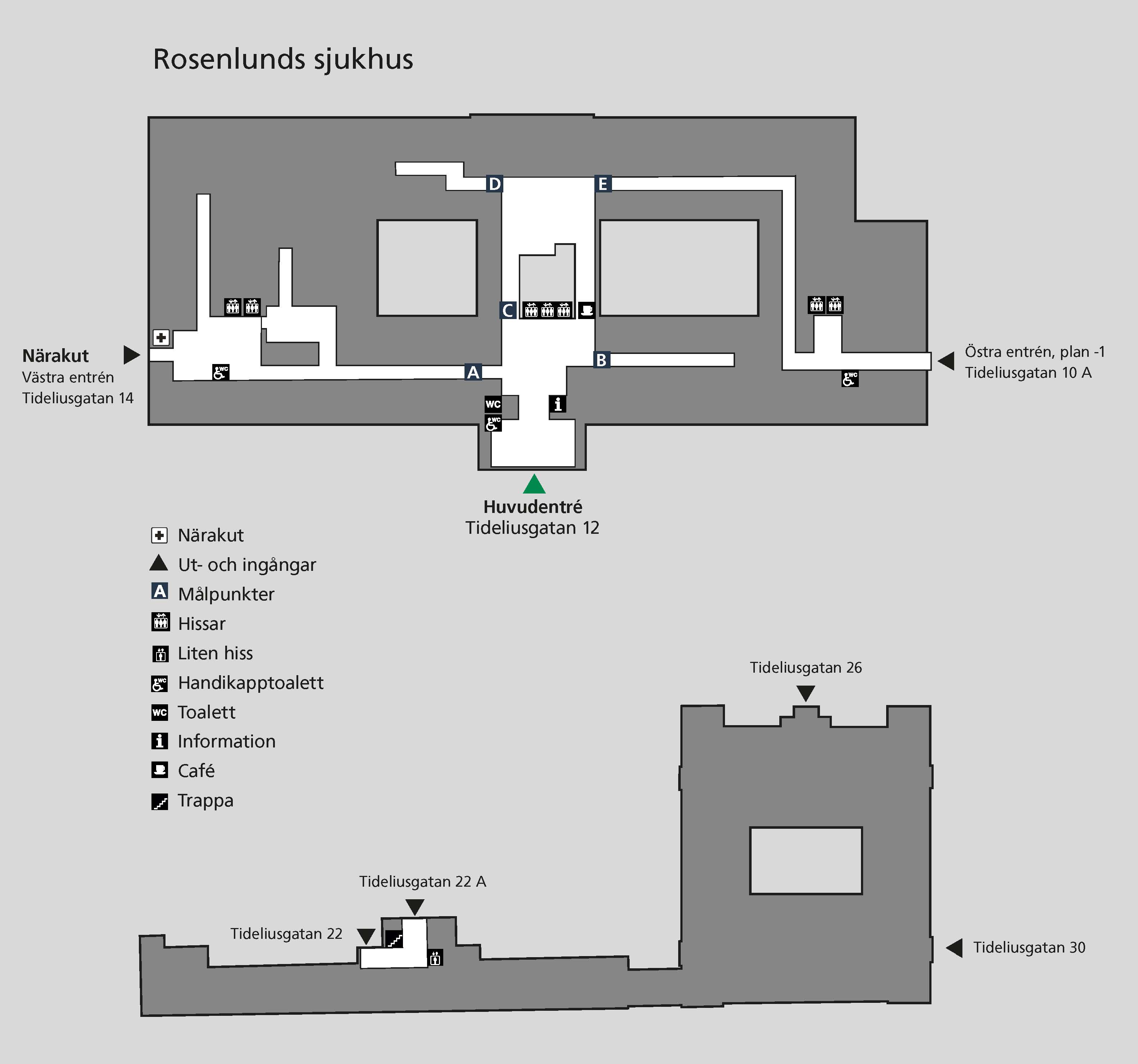 Här hittar du kartor över Rosenlunds sjukhus med utmärkta parkeringar för besökare, personal, cykel och motorcykel. Här finns även karta för färdväg för taxi och färdtjänst.