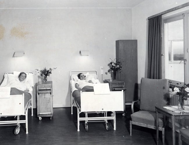 När Södersjukhuset byggdes på 1940-talet var flyglarna helt dedikerade till inneliggande vård och en bärande tanke var att patienterna som vårdades en längre tid skulle få ta del av en läkande miljö med mycket grönska, ljus och luft mot vattnet. Då hade man också övergivit tanken på stora sjuksalar med upp till 20 sängplatser och utformade istället Södersjukhusets lokaler för 2-6 platser i flerbäddsrum.