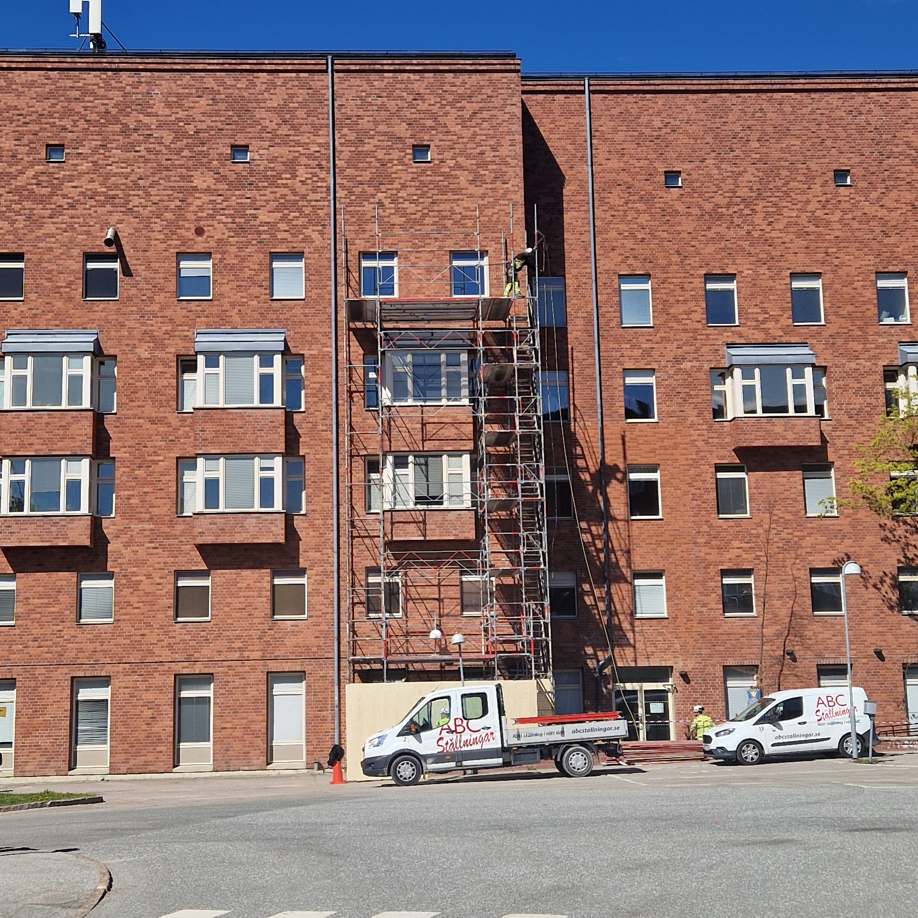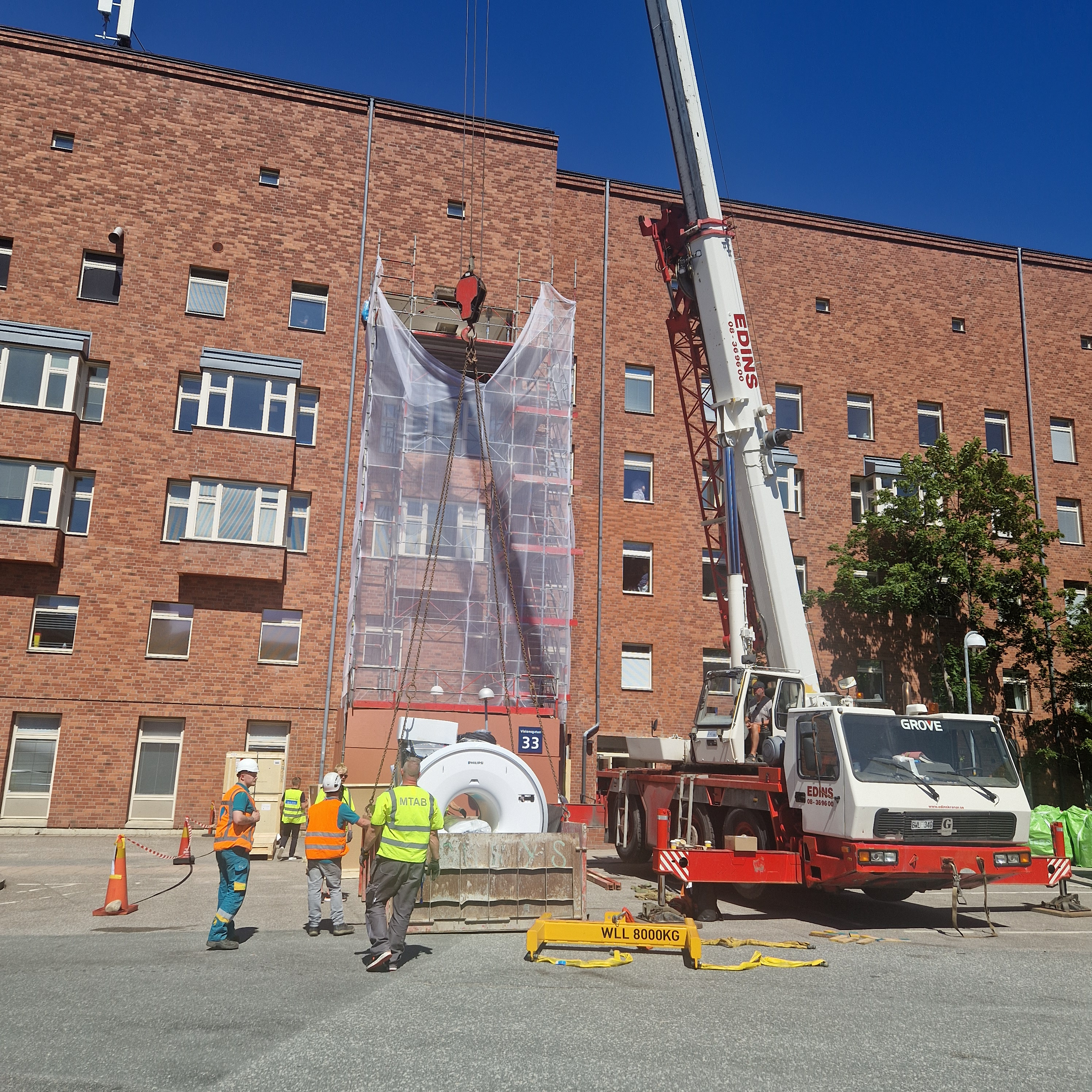 Här kan du ta del av några bilder från när den nya MR-kameran lyftes på plats genom ett hål i fasaden.