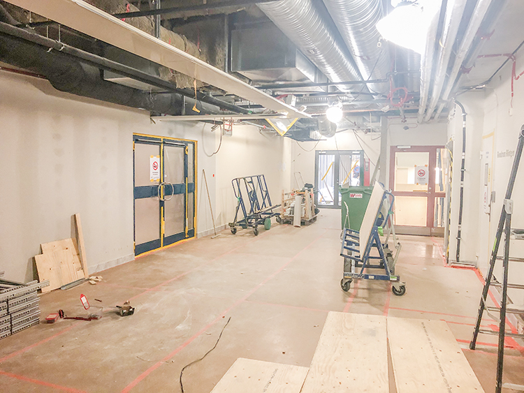 Mitt i sjukhuset där byggnad 30 möter byggnad 40 flyttar vi dörrar, lägger om korridorer, skapar nya korridorer för anslutning mot nya byggnaderna 20 och 45. Knepigt arbete då verksamheten pågår som vanligt runt om.